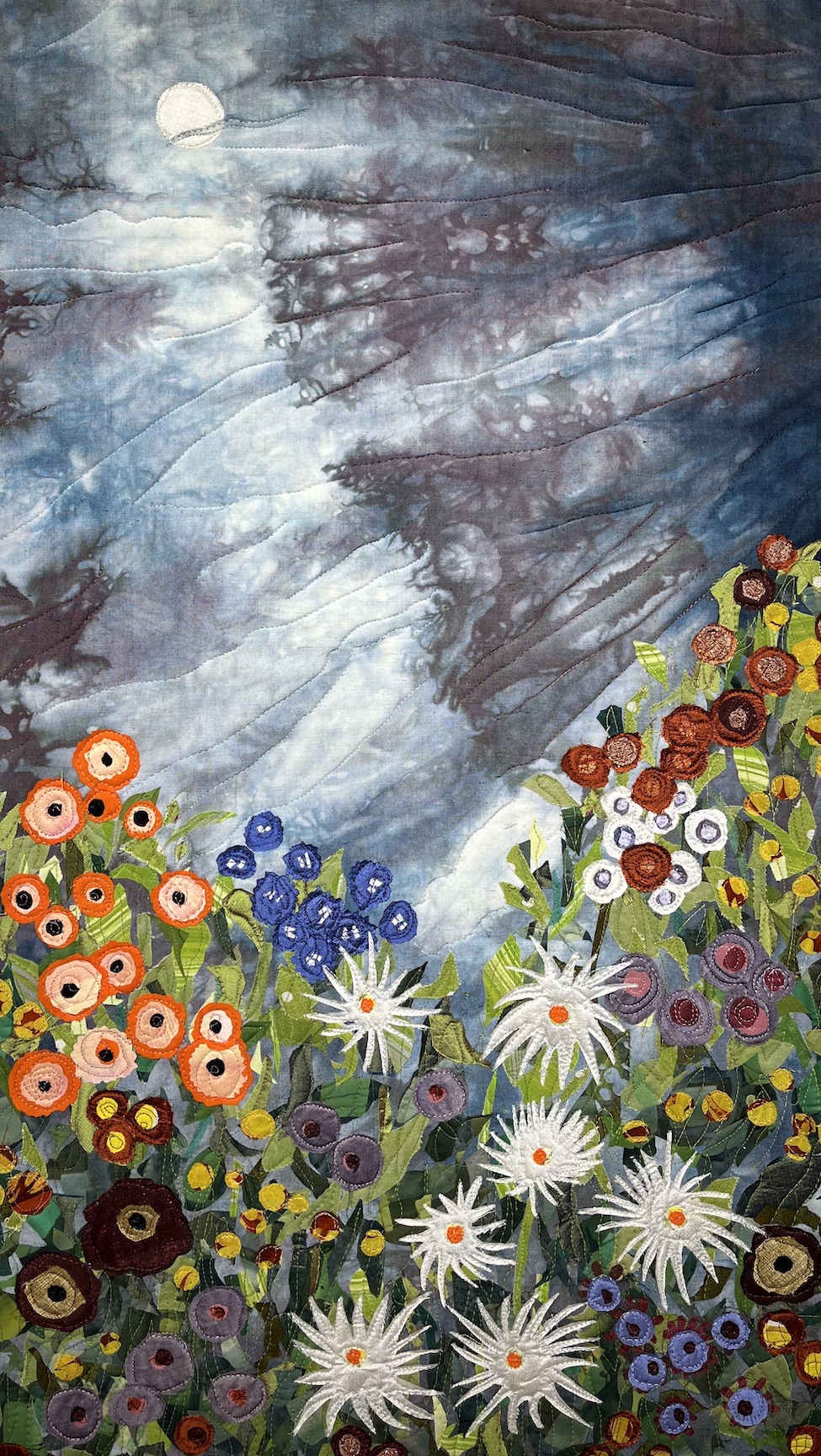 Mixed Media /paper on canvas is made of sumi paintings, torn, glued to a black canvas, and machine stitched. Currently, I am experimenting with this technique and am quite excited about it.