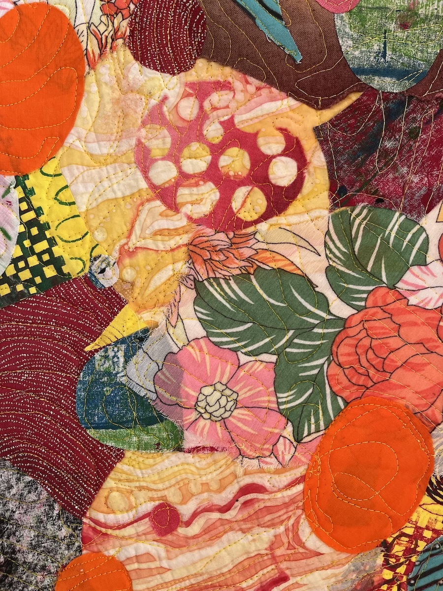 Hand-painted, mixed fabrics: cotton, silks, polyester fabrics, designed, pieced, and fused, machine quilted by myself.